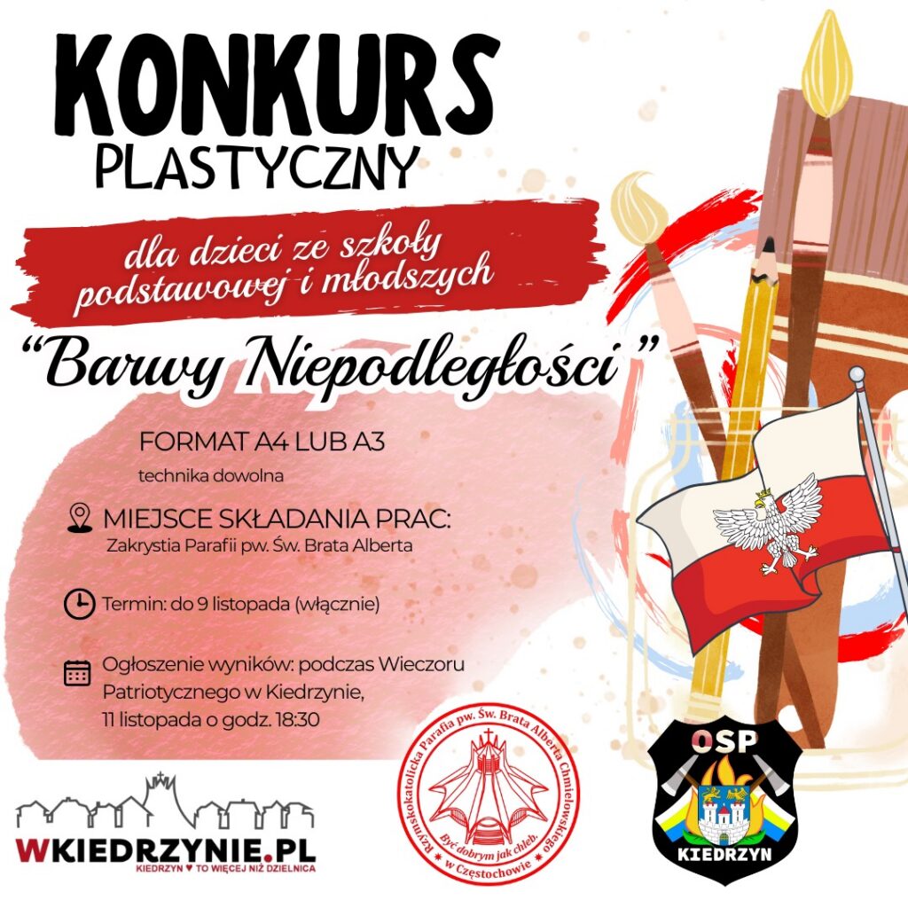 Z okazji Narodowego Święta Niepodległości zapraszamy dzieci ze szkoły podstawowej oraz młodsze do udziału w konkursie plastycznym „Barwy Niepodległości”.